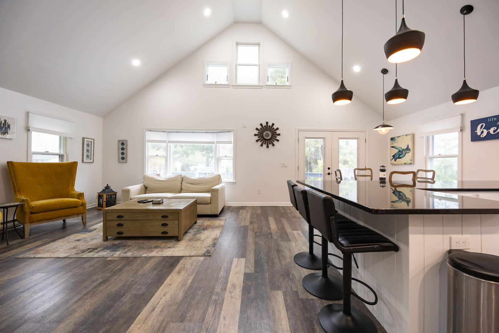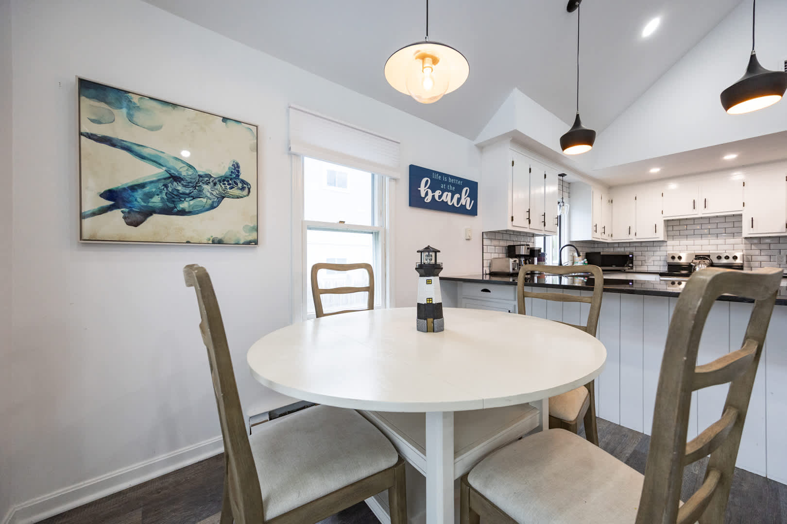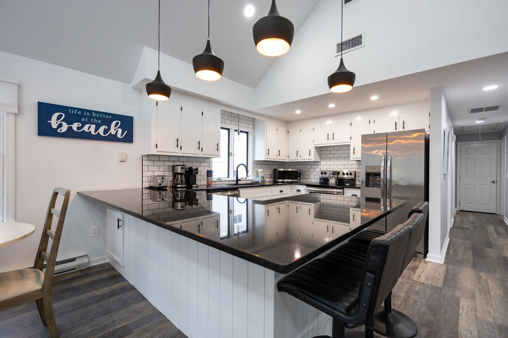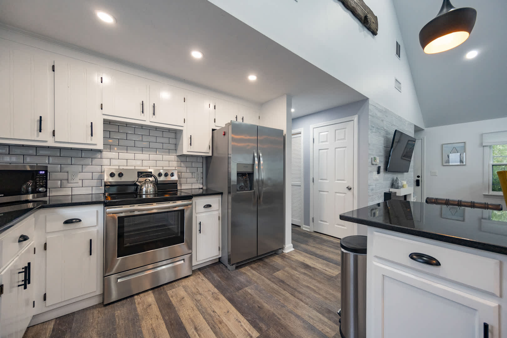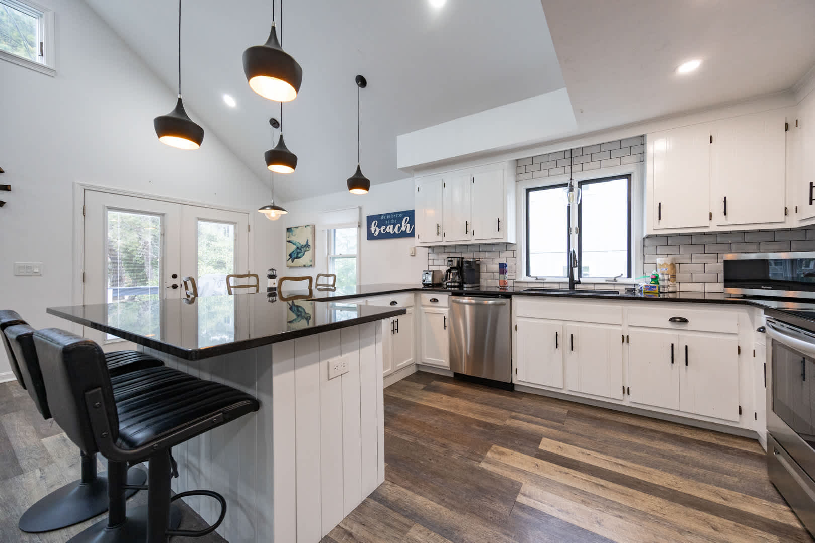 The modern kitchen is equipped with updated appliances, a flat top stove, and plenty of seating with a dining table for up to 6 plus 3 barstools at the counter. The living room is designed for relaxation, featuring a mounted LED Smart TV to log into your favorite streaming apps and an electric fireplace that adds warmth and ambiance. Central air keeps the home comfortable year-round.