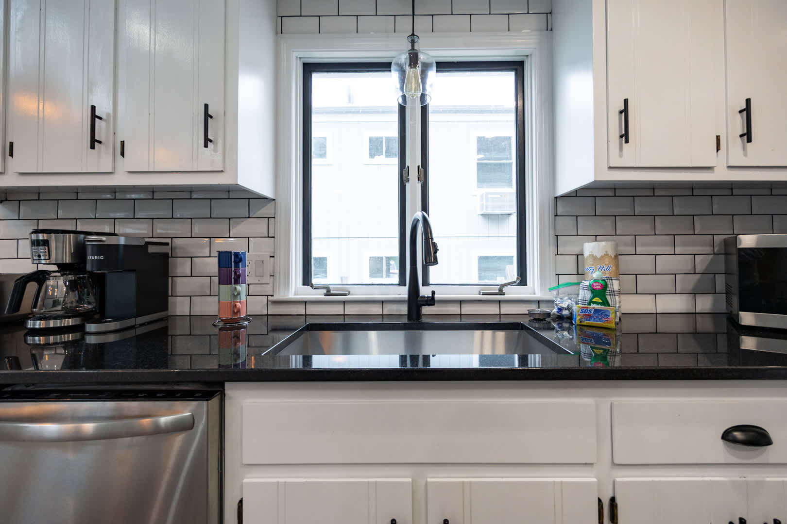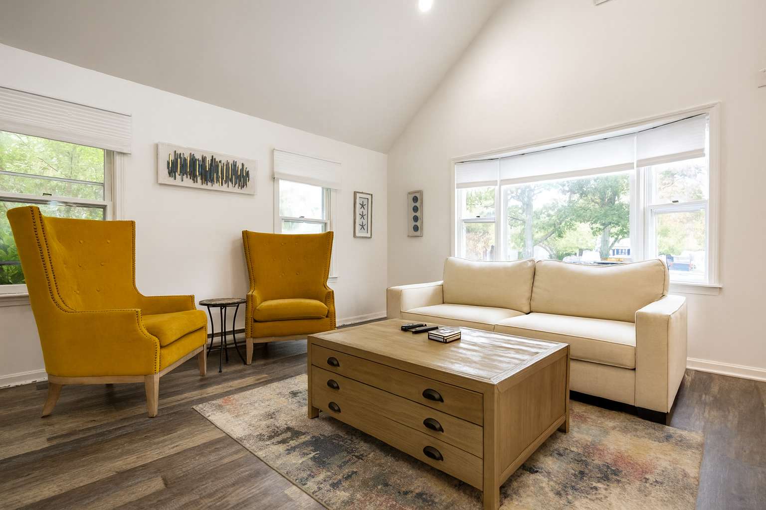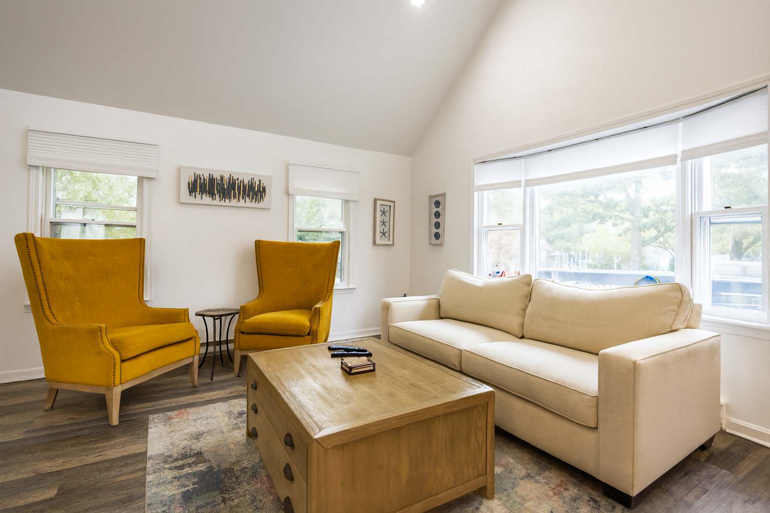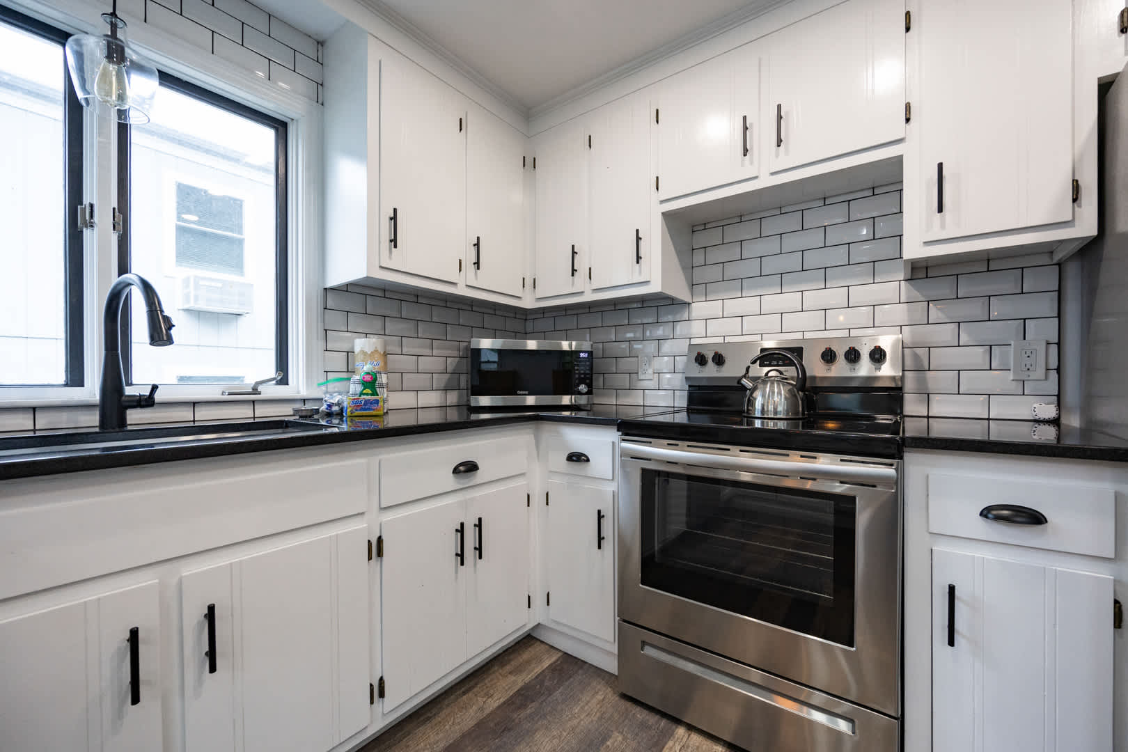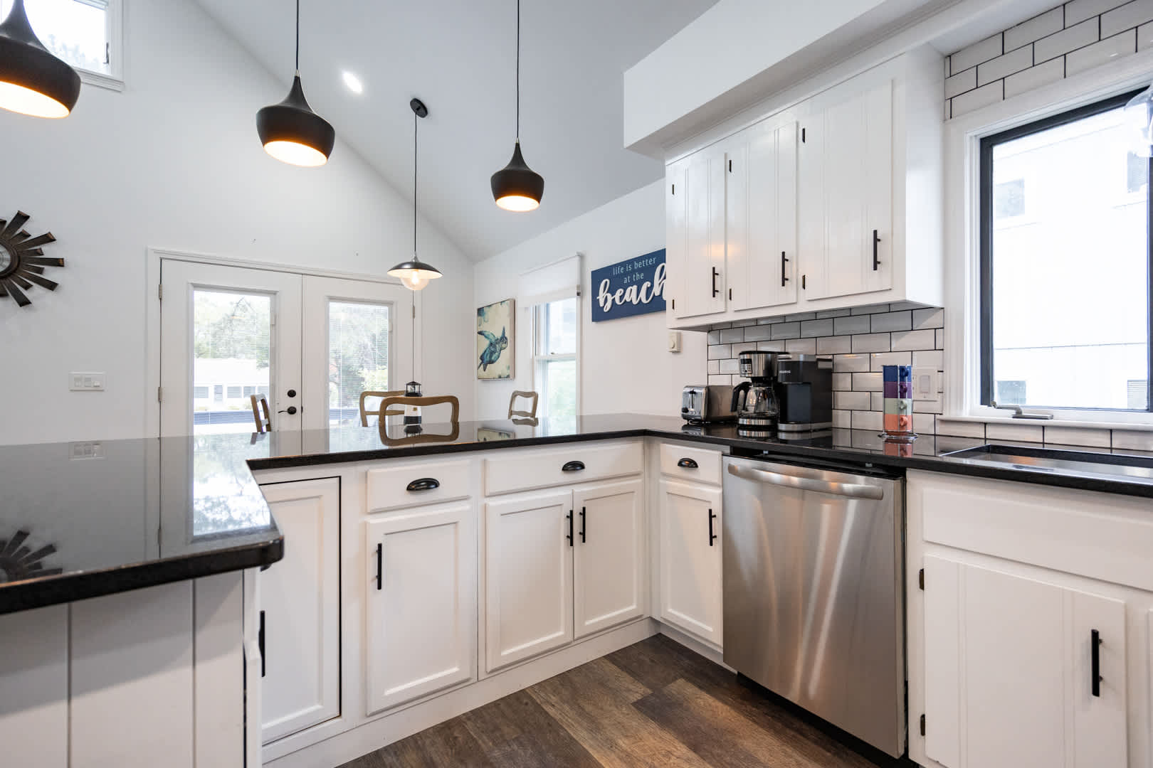 The modern kitchen is equipped with updated appliances, a flat top stove, and plenty of seating with a dining table for up to 6 plus 3 barstools at the counter. The living room is designed for relaxation, featuring a mounted LED Smart TV to log into your favorite streaming apps and an electric fireplace that adds warmth and ambiance. Central air keeps the home comfortable year-round.